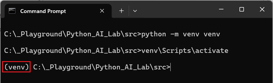 python -m venv venv. This creates a folder for your environment. - Activate: Run