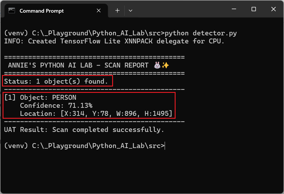 import mediapipe as mpfrom mediapipe.tasks import pythonfrom mediapipe.tasks.python import vision# ==========================================# Annie's AI Lab - Object Detection Script# Model: EfficientDet-Lite0# ==========================================def run_detection(): # 1. Configuration: Set the model path # Ensure 'efficientdet_lite0.tflite' is in the same directory model_path = 'efficientdet_lite0.tflite' # 2. Detector Options Setup # score_threshold: Lowering this might help find the "hidden" celery! base_options = python.BaseOptions(model_asset_path=model_path) options = vision.ObjectDetectorOptions( base_options=base_options, score_threshold=0.3, running_mode=vision.RunningMode.IMAGE ) # 3. Create Detector Instance with vision.ObjectDetector.create_from_options(options) as detector: # 4. Load the input image # Ensure the filename matches your photo (e.g., 'test.jpeg') image_file = 'test.jpeg' try: numpy_image = mp.Image.create_from_file(image_file) except Exception as e: print(f"Error: Could not load image file '{image_file}'. {e}") return # 5. Execute Inference detection_result = detector.detect(numpy_image) # 6. Output Analysis Report print("\n" + "="*45) print(" ANNIE'S PYTHON AI LAB - SCAN REPORT 🐰✨") print("="*45) if not detection_result.detections: print("Status: No objects detected above threshold.") print("Action: Try lowering the score_threshold in the code.") else: print(f"Status: {len(detection_result.detections)} object(s) found.") print("-" * 45) for i, detection in enumerate(detection_result.detections): category = detection.categories[0] label = category.category_name.upper() confidence = round(category.score * 100, 2) # Retrieve Bounding Box Coordinates bbox = detection.bounding_box print(f"[{i+1}] Object: {label}") print(f" Confidence: {confidence}%") print(f" Location: [X:{bbox.origin_x}, Y:{bbox.origin_y}, W:{bbox.width}, H:{bbox.height}]") print("-" * 45) print("UAT Result: Scan completed successfully.")if __name__ == "__main__": run_detection()