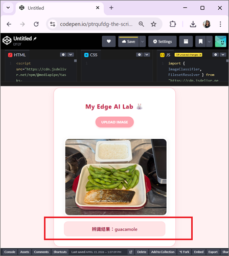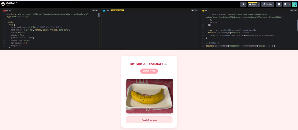 https://cdn.jsdelivr.net/npm/@mediapipe/tasks-vision/vision_bundle.mjs<style> body { background-color: #fff1f2; font-family: 'Segoe UI', Tahoma, Geneva, Verdana, sans-serif; color: #9f1239; display: flex; justify-content: center; align-items: center; min-height: 100vh; margin: 0; } #container { background-color: #ffffff; padding: 40px; border-radius: 25px; box-shadow: 0 10px 25px rgba(159, 18, 57, 0.08); text-align: center; border: 2px solid #fecdd3; max-width: 400px; } h1 { color: #be123c; font-size: 24px; margin-bottom: 25px; letter-spacing: 1px; } /* 自定義粉色按鈕 */ .custom-file-upload { display: inline-block; padding: 12px 24px; cursor: pointer; background-color: #fda4af; /* Baby Pink 按鈕 */ color: #ffffff; border-radius: 50px; font-weight: bold; text-transform: uppercase; font-size: 14px; transition: all 0.3s ease; margin-bottom: 20px; box-shadow: 0 4px 6px rgba(253, 164, 175, 0.3); } .custom-file-upload:hover { background-color: #f43f5e; transform: translateY(-2px); } #fileInput { display: none; } #result { margin-top: 20px; font-size: 18px; font-weight: 600; color: #9f1239; background-color: #ffe4e6; padding: 15px; border-radius: 15px; border: 1px solid #fecdd3; } #imagePreview { margin-top: 20px; border-radius: 20px; border: 5px solid #ffffff; box-shadow: 0 5px 15px rgba(0,0,0,0.08); }</style><div id="container"> <h1>My Edge AI Laboratory 🐰</h1> <label for="fileInput" class="custom-file-upload"> Upload photo </label> <input type="file" id="fileInput" accept="image/*"> <img id="imagePreview" style="max-width: 100%; display: none;"> <div id="result">Ready...</div></div>